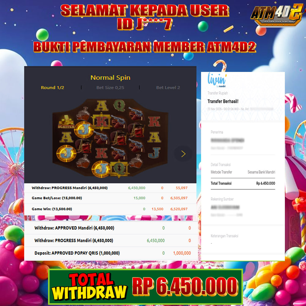 ATM4D2 dikenal sebagai situs terpercaya yang selalu menghadirkan pengalaman bermain slot online yang aman, fair, dan berlisensi resmi. Di sini, kami tidak hanya sekadar memberikan janji, tapi bukti nyata berupa slip kemenangan yang dapat Anda lihat secara langsung.