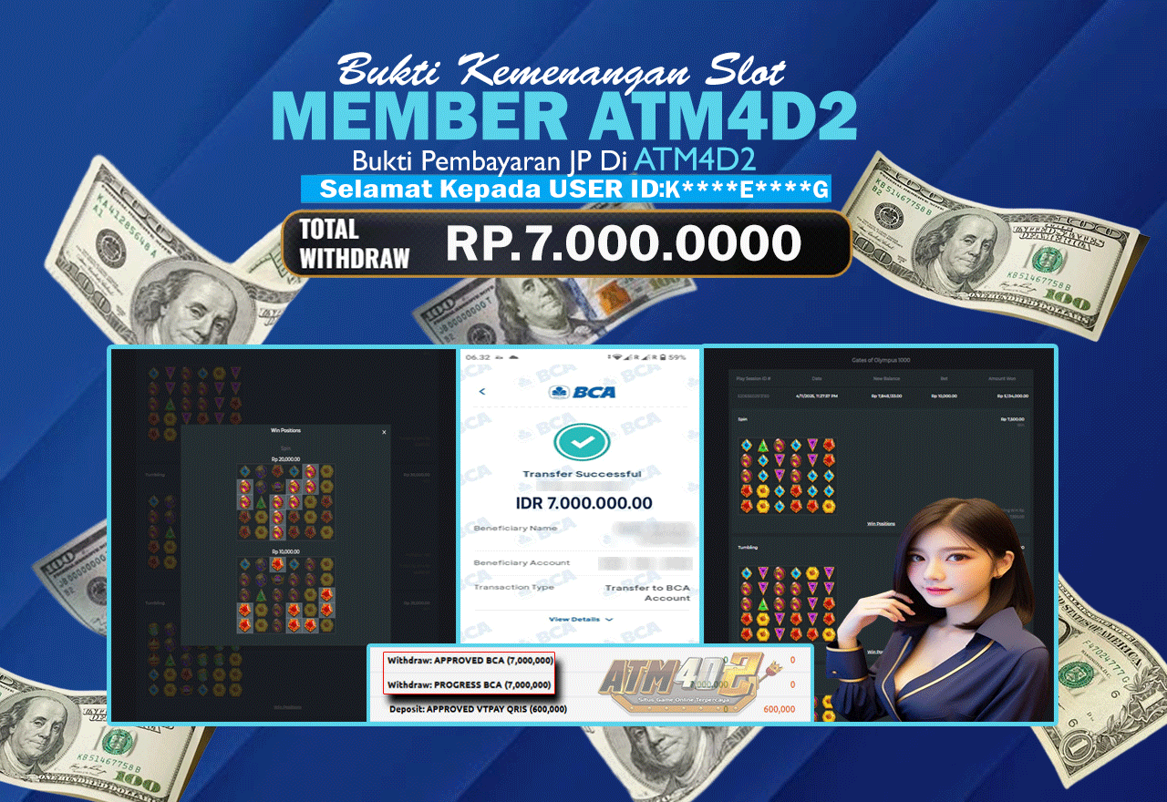 ATM4D2 dikenal sebagai situs terpercaya yang selalu menghadirkan pengalaman bermain slot online yang aman, fair, dan berlisensi resmi. Di sini, kami tidak hanya sekadar memberikan janji, tapi bukti nyata berupa slip kemenangan yang dapat Anda lihat secara langsung.