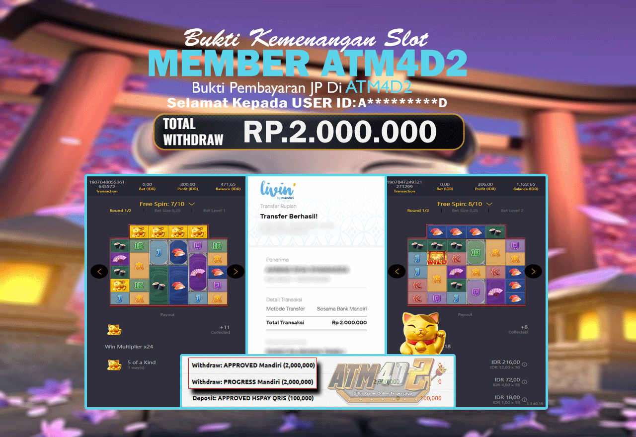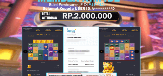 ATM4D2 dikenal sebagai situs terpercaya yang selalu menghadirkan pengalaman bermain slot online yang aman, fair, dan berlisensi resmi. Di sini, kami tidak hanya sekadar memberikan janji, tapi bukti nyata berupa slip kemenangan yang dapat Anda lihat secara langsung.