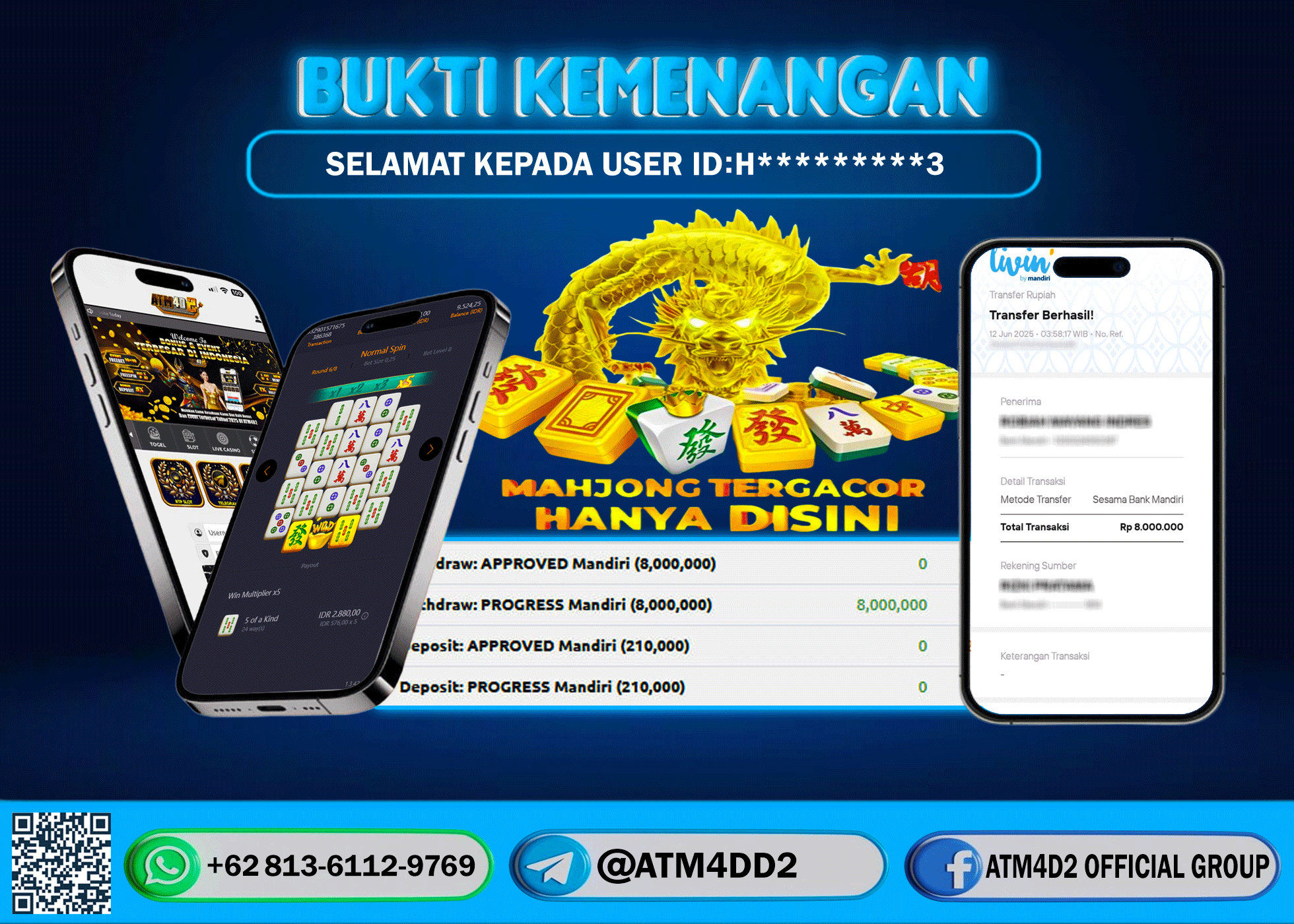 ATM4D2 dikenal sebagai situs terpercaya yang selalu menghadirkan pengalaman bermain slot online yang aman, fair, dan berlisensi resmi. Di sini, kami tidak hanya sekadar memberikan janji, tapi bukti nyata berupa slip kemenangan yang dapat Anda lihat secara langsung.