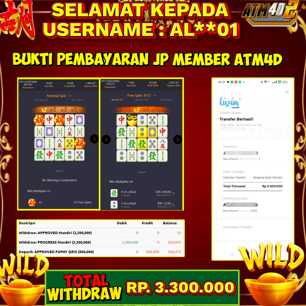 ATM4D2 dikenal sebagai situs terpercaya yang selalu menghadirkan pengalaman bermain slot online yang aman, fair, dan berlisensi resmi. Di sini, kami tidak hanya sekadar memberikan janji, tapi bukti nyata berupa slip kemenangan yang dapat Anda lihat secara langsung.