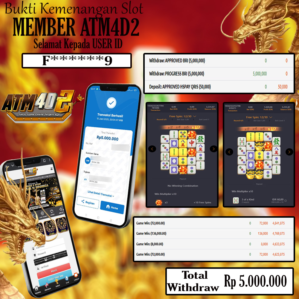 ATM4D2 dikenal sebagai situs terpercaya yang selalu menghadirkan pengalaman bermain slot online yang aman, fair, dan berlisensi resmi. Di sini, kami tidak hanya sekadar memberikan janji, tapi bukti nyata berupa slip kemenangan yang dapat Anda lihat secara langsung.