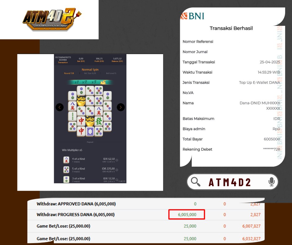 ATM4D2 dikenal sebagai situs terpercaya yang selalu menghadirkan pengalaman bermain slot online yang aman, fair, dan berlisensi resmi. Di sini, kami tidak hanya sekadar memberikan janji, tapi bukti nyata berupa slip kemenangan yang dapat Anda lihat secara langsung.