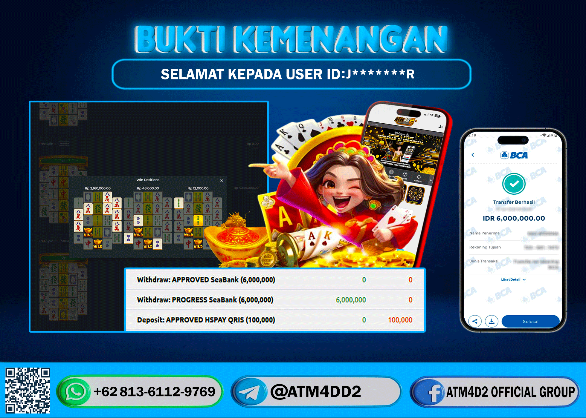 ATM4D2 dikenal sebagai situs terpercaya yang selalu menghadirkan pengalaman bermain slot online yang aman, fair, dan berlisensi resmi. Di sini, kami tidak hanya sekadar memberikan janji, tapi bukti nyata berupa slip kemenangan yang dapat Anda lihat secara langsung.