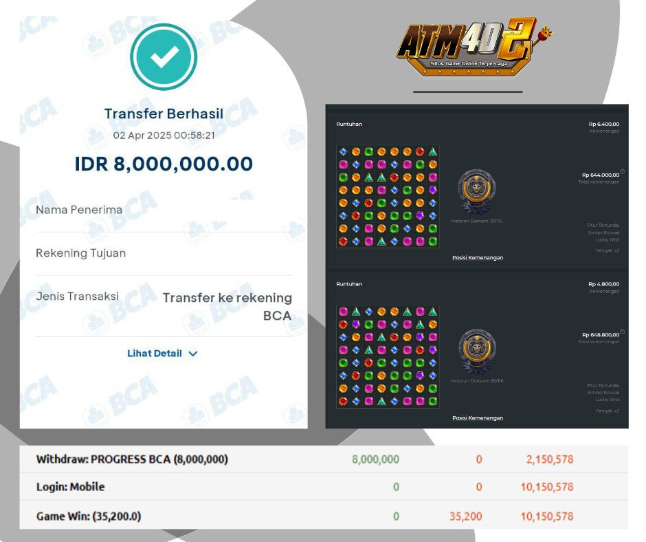 ATM4D2 dikenal sebagai situs terpercaya yang selalu menghadirkan pengalaman bermain slot online yang aman, fair, dan berlisensi resmi. Di sini, kami tidak hanya sekadar memberikan janji, tapi bukti nyata berupa slip kemenangan yang dapat Anda lihat secara langsung.