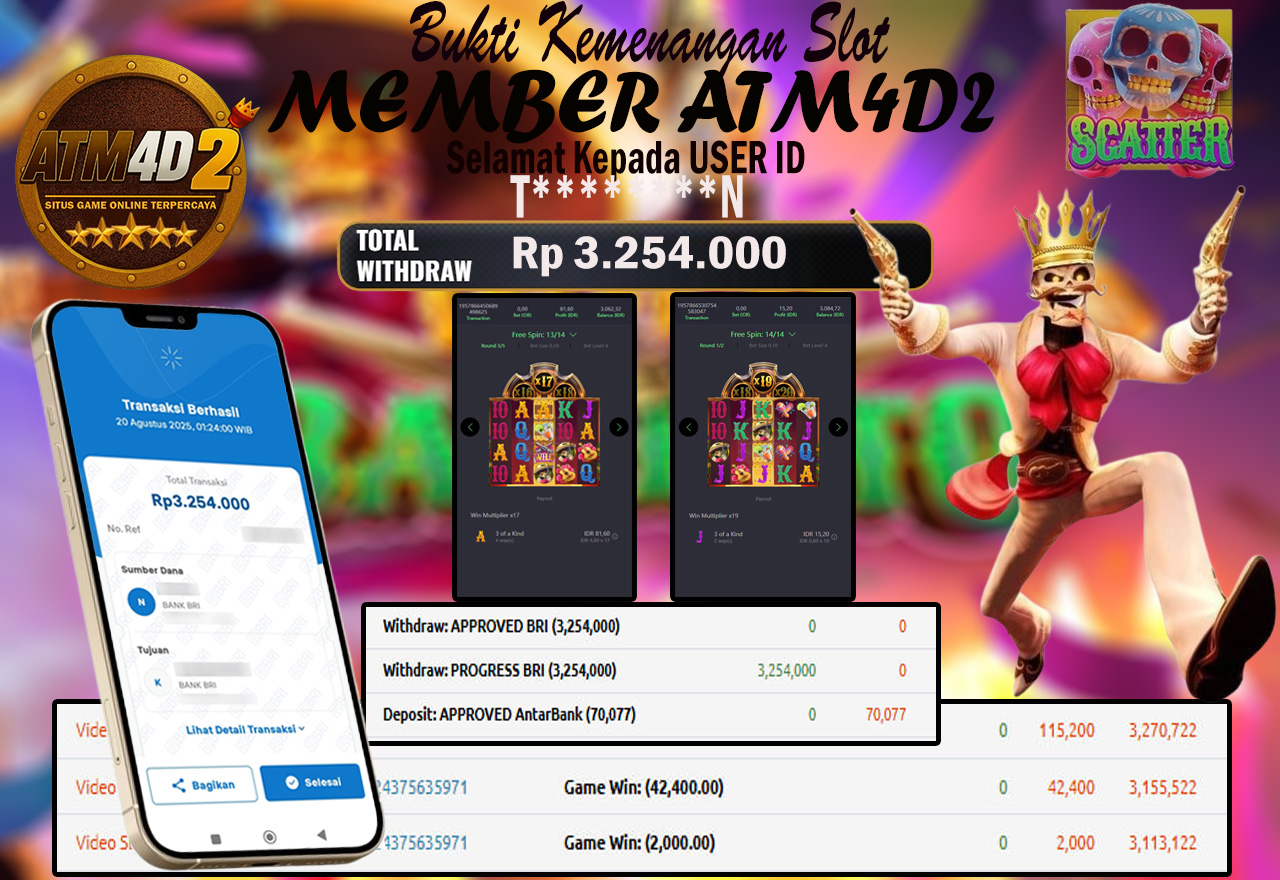 ATM4D2 dikenal sebagai situs terpercaya yang selalu menghadirkan pengalaman bermain slot online yang aman, fair, dan berlisensi resmi. Di sini, kami tidak hanya sekadar memberikan janji, tapi bukti nyata berupa slip kemenangan yang dapat Anda lihat secara langsung.