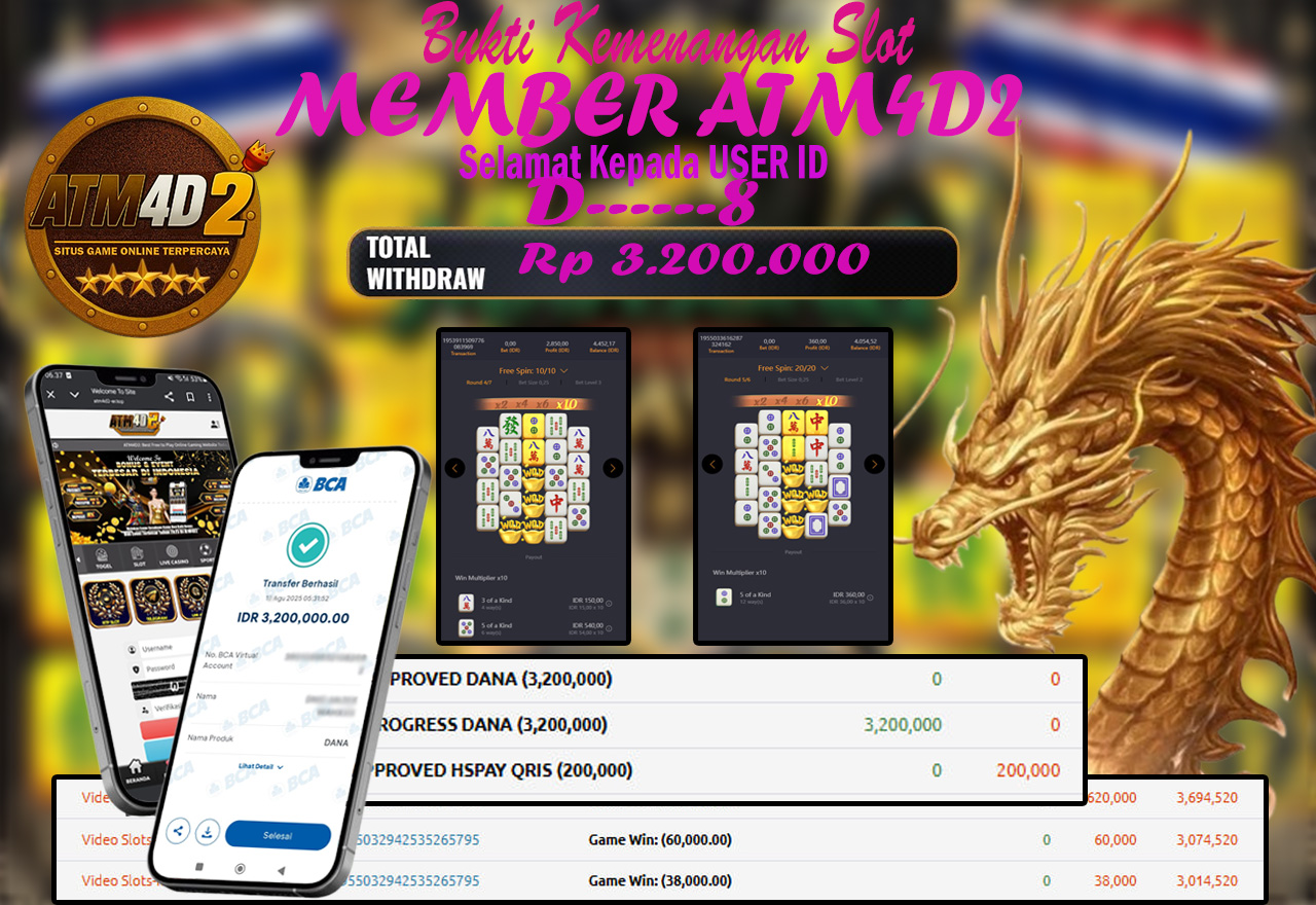 ATM4D2 dikenal sebagai situs terpercaya yang selalu menghadirkan pengalaman bermain slot online yang aman, fair, dan berlisensi resmi. Di sini, kami tidak hanya sekadar memberikan janji, tapi bukti nyata berupa slip kemenangan yang dapat Anda lihat secara langsung.