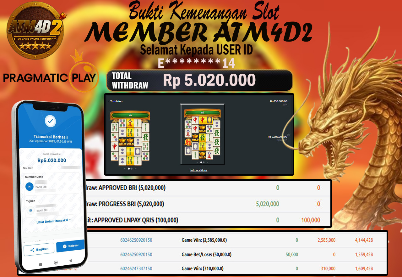 ATM4D2 dikenal sebagai situs terpercaya yang selalu menghadirkan pengalaman bermain slot online yang aman, fair, dan berlisensi resmi. Di sini, kami tidak hanya sekadar memberikan janji, tapi bukti nyata berupa slip kemenangan yang dapat Anda lihat secara langsung.