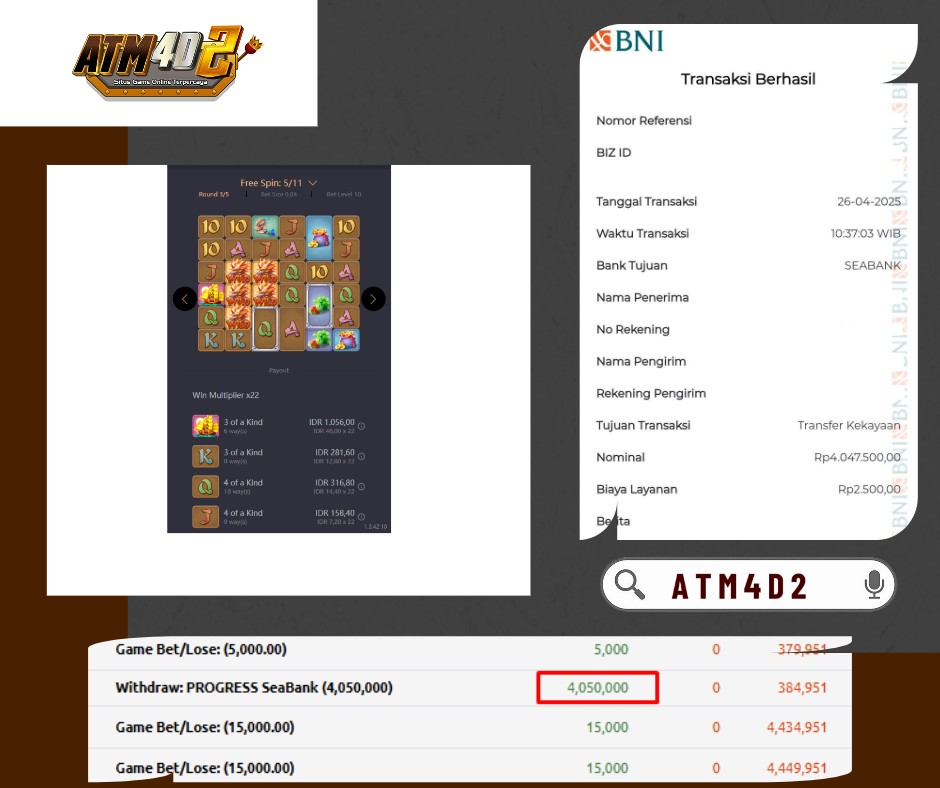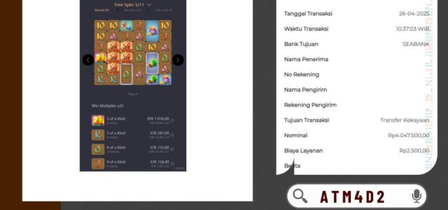 ATM4D2 dikenal sebagai situs terpercaya yang selalu menghadirkan pengalaman bermain slot online yang aman, fair, dan berlisensi resmi. Di sini, kami tidak hanya sekadar memberikan janji, tapi bukti nyata berupa slip kemenangan yang dapat Anda lihat secara langsung.